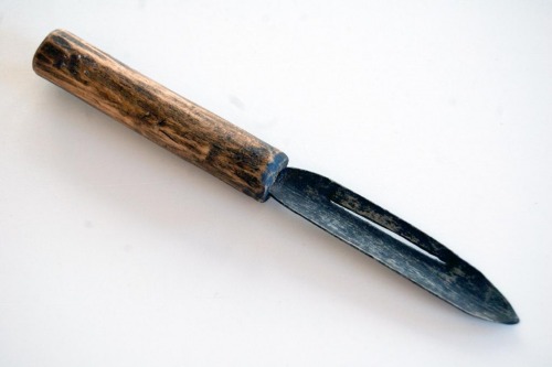 Utensile composto da un manico cilindrico di legno rozzamente sagomato e da una lama di forma lanceolata concava con una fenditura ricavata nella parte centrale.Notizie storico-critiche