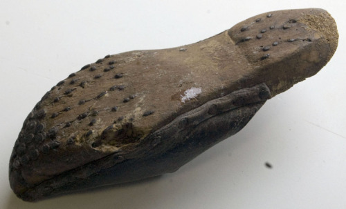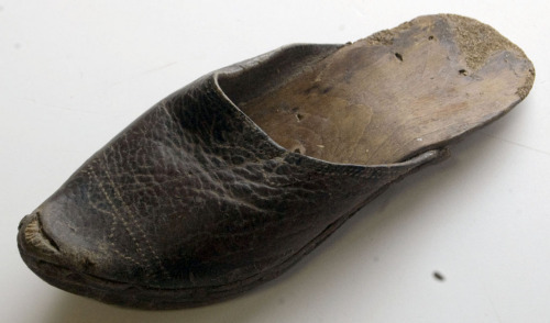calzatura del piede sinistro con suola in legno e tomaia in cuoio, utilizzata da bambini in casa e all'aperto