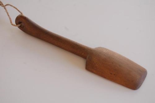 Utensile in legno composto da un manico a sezione ovale, con estremità arrotondata e forata, e da una paletta di forma rettangolare con una facciata piatta e laltra convessa. Lungo il manico, alla base della paletta, residui di decorazione geometrica a rombi.Notizie storico-critiche