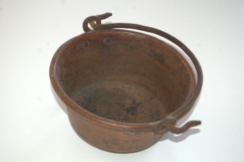 Recipiente in rame di forma svasata con fondo tondeggiante e bordo superiore ripiegato; completo di manico in ferro ad arco, le cui estremità sono inserite nei due anelli laterali, fissati con borchie in rame al contenitore.Notizie storico-critiche