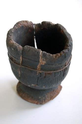 Recipiente in legno a sezione circolare, con fondo concavo, ricavato da un unico pezzo di legno; presenta una modanatura esterna decorativa, appena sotto il bordo superiore; assottigliato nella parte inferiore, si allarga di nuovo in una base di forma circolare.Notizie storico-critiche