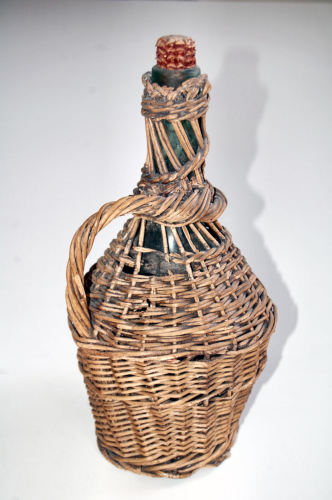 recipiente di vetro soffiato per liquidi, di forma panciuta, rivestito da un intreccio di rametti di salice sino al punto in cui si assottiglia a formare il collo lungo e stretto. Completo di manico in vimini intrecciato e fissato al collo della bottiglia. Della bottiglia rimane integro solamente il collo; la parte inferiore è in frantumi allinterno dellimpagliatura. Tappo costituito da un pezzo di tutolo.Notizie storico-critiche