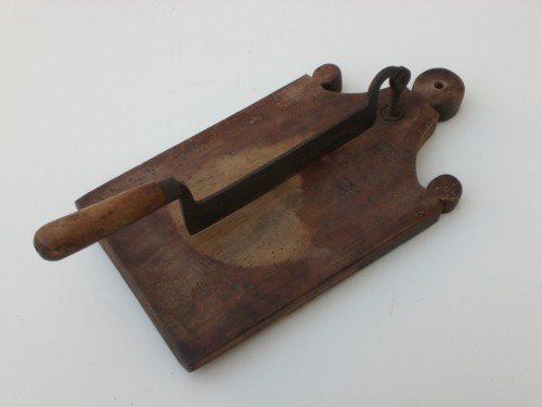 Tagliere in legno il cui bordo presenta tre decorazioni rotonde, quella centrale forata per poter essere appeso. Al tagliere è fissato in maniera stabile un grosso coltello con manico in legno.Notizie storico-critiche