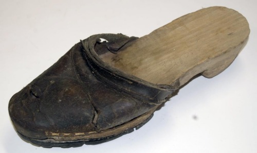 calzature con suola in legno e tomaia in cuoio, utilizzate da uomini e donne in casa e all'aperto