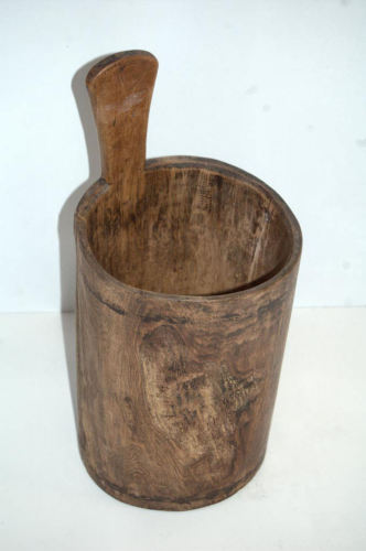 recipiente di forma cilindrica ricavato da un unico pezzo di legno di faggio; il bordo superiore si allunga nellimpugnatura; sulla superficie esterna sono visibili i segni dei cerchi metallici di chiusura ora mancantiNotizie storico-critiche
