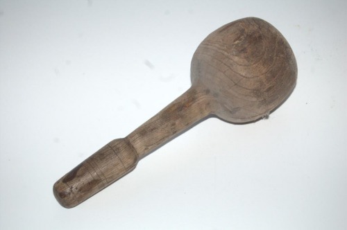 Utensile in legno formato da un manico a sezione circolare sagomato, con estremità inferiore più larga e decorata con sottili linee parallele, e da un corpo sferico posto allestremità opposta.Notizie storico-critiche