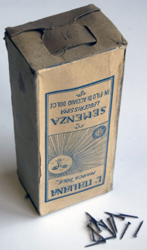 contenitore di cartone a base rettangolare; contiene numerose semenze in acciaio, ovvero chiodini utilizzati nella produzione di calzature, in genere per fissare la tomaia o il tacco alla suola