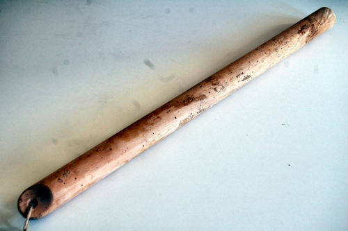 lungo cilindro in legno con un'estremità assottigliata, sagomata e forata al centro; attraverso il foro è fissato uno spagoNotizie storico-critiche