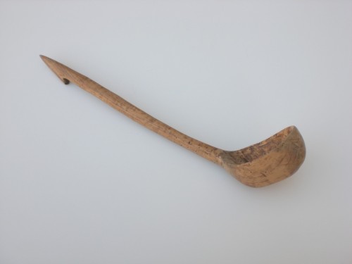 Utensile in legno, ricavato da un unico pezzo di legno con un manico lungo, terminante con un gancio per appenderlo e un corpo principale a forma di tazza allungata.Notizie storico-critiche