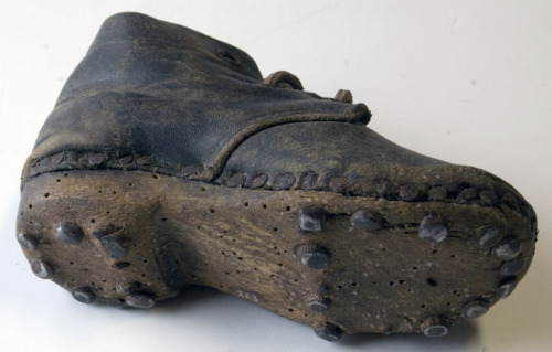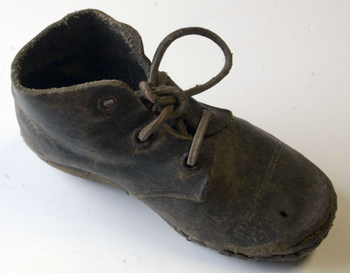 calzatura del piede sinistro da bambino con suola in legno e tomaia in cuoio utilizzata da bambini per attività all'aperto, specie nel periodo invernale