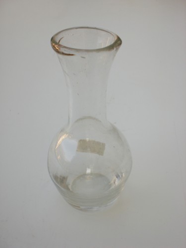 Recipinte in vetro trasparente di capienza pari ad un quarto di litro. Il corpo centrale ha forma piuttoasto arrotondata e si stringe verso il collo. Loggetto poi si allarga nouvamente verso la bocca.Notizie storico-critiche