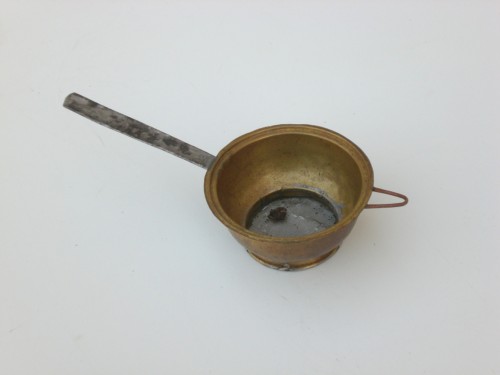utensile in metallo, ottonato nel corpo centrale, il manico è in ferro e il gancio per appenderlo è in filo di rame. La rete è stata saldata al fondo del colino con satgno , come anche le altre saldature.Notizie storico-critiche