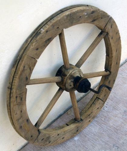 parte di un filatoio orizzontale con cui si eseguiva l'operazione necessaria a torcere le fibre e realizzare il filo. La ruota permette al dispositivo di filatura di girare, essendo collegata al fuso attraverso un cavo di trasmissione perpetuo.