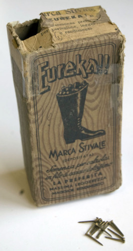 contenitore di cartone a base rettangolare; contiene numerose semenze in acciaio, ovvero chiodini utilizzati nella produzione di calzature, in genere per fissare la tomaia o il tacco alla suola