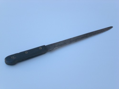 Coltello da cucina con lama lunga e sottile in ferro e manico in legno. La lama è inserita tra due parti in legno unite ad essa tramite tre brocche in ottone.Notizie storico-critiche