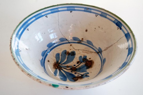 Recipiente di forma circolare con bordo alto svasato e spigolo arrotondato; il diametro del piede è circa un terzo del diametro del bordo superiore; in terracotta smaltata allinterno di bianco e allesterno rivestita di gesso; decorazione interna a motivi geometrici e vegetali azzurri e bordo superiore verde.Notizie storico-critiche