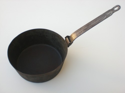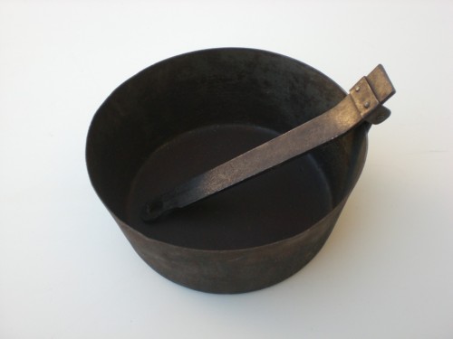 Recipiente in lega di ferro, dalle pareti svasate e piuttosto alte, il manico, anchesso in metallo, è unito al corpo mediante una cerniera fissata da chiodi, in modo da poter essere ripiegato allinterno della padella.Notizie storico-critiche