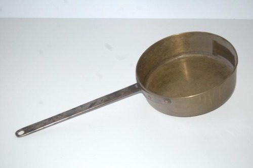 Recipiente in ottone a sezione circolare, con fondo piatto e sponda diritta; dotato di lungo manico piatto in ferro, con estremità forata per appenderlo alla parete; lestremità opposta si allarga in una bandella orizzontale, fissata al recipiente con quattro borchie in rame.Notizie storico-critiche