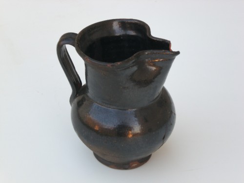 Recipiente di terracotta invetriata di colore nero, con beccuccio schiacciato. Il corpo centrale è di forma tondeggiante e si restringe verso l'alto per poi riaprirsi in un ampio collo. Presenta un manico opposto al beccuccio.Notizie storico-critiche