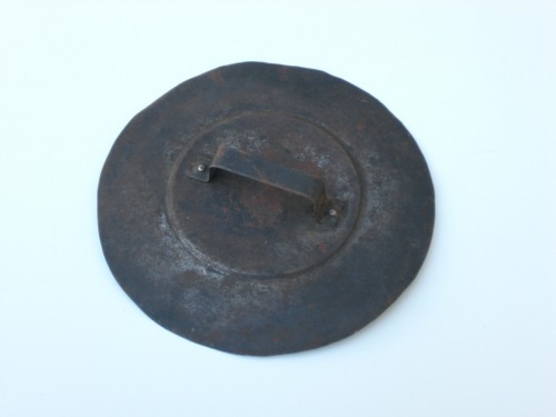 Leggero disco metallico. la parte centrale è lievemente rialzata rispetto al resto delloggetto. Al centro è fissato tramite piccoli chiodi metallici un manico.Notizie storico-critiche