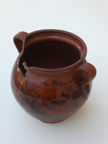Recipiente di terracotta invetriata internamente e in parte esternamente, a forma di pigna, si stringe verso il fondo, la bocca risulta essere più ampia della base. Due manici sono posti simmetricamente ai lati della bocca. Di colore ocra.Notizie storico-critiche