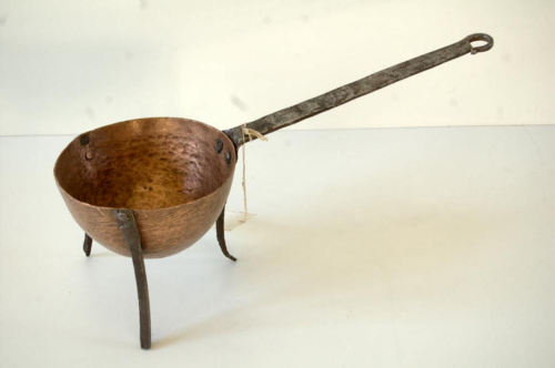 recipiente in rame, a sezione circolare, di forma semisferica. Dotato di lungo manico piatto in ferro, con estremità ad occhiello per appenderlo alla parete; lestremità opposta, fissata al recipiente con due borchie di ferro, si allunga in un piedino a sezione rettangolare appuntito e leggermente arcuato. Il recipiente è dotato di altri due piedini di ferro fissati con due borchieNotizie storico-critiche
