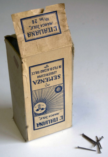 contenitore di cartone a base rettangolare; contiene numerose semenze in acciaio, ovvero chiodini utilizzati nella produzione di calzature, in genere per fissare la tomaia o il tacco alla suola
