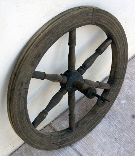 parte di un filatoio orizzontale con cui si eseguiva l'operazione necessaria a torcere le fibre e realizzare il filo. La ruota permette al dispositivo di filatura di girare, essendo collegata al fuso attraverso un cavo di trasmissione perpetuo.