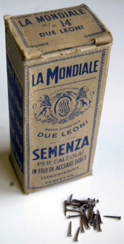 contenitore di cartone a base rettangolare; contiene numerose semenze in acciaio, ovvero chiodini utilizzati nella produzione di calzature, in genere per fissare la tomaia o il tacco alla suola