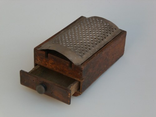 Utensile fornato da una lamiera metallica ricurva e forata, applicata ad una base di legno forata a forma di parallelepipedo e con un cassetto estraibile per raccogliere il cibo grattuggiato.