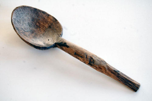 utensile in legno rozzamente scolpito, composto da un corto manico di forma irregolare, e da una concavità di forma ovale.Notizie storico-critiche