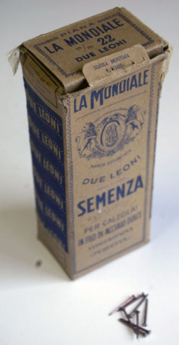 contenitore di cartone a base rettangolare; contiene numerose semenze in acciaio, ovvero chiodini utilizzati nella produzione di calzature, in genere per fissare la tomaia o il tacco alla suola