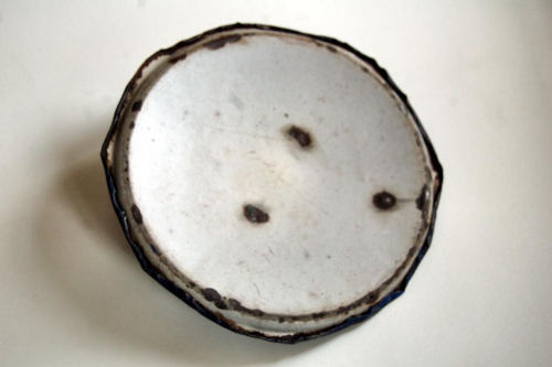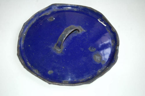 oggetto in ferro di forma circolare a calotta; con bordo rialzato e ripiegato verso linterno; dotato di manico arcuato, saldato sulla sommità del coperchio stesso. Smaltato di colore blu sulla sommità e di bianco allinternoNotizie storico-critiche