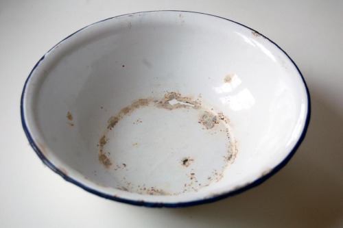 Recipiente di forma circolare con bordo alto svasato e spigolo arrotondato; il diametro della base è circa la metà del diametro del bordo superiore; in latta smaltata di bianco e bordata di blu.Notizie storico-critiche