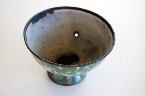 Recipiente di forma semisferica con bordo arrotondato, poggiante su un piede di forma circolare svasato, fissato con 3 borchie; il diametro del piede è circa la metà del diametro del bordo superiore; in ferro smaltato allinterno di bianco e allesterno di verde a chiazze bianche.Notizie storico-critiche