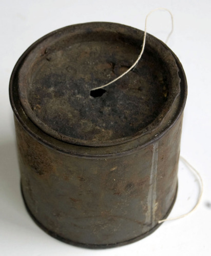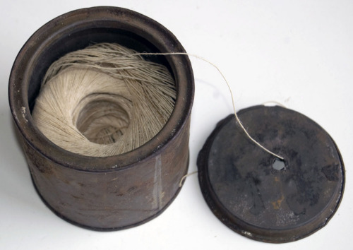 contenitore cilindrico di latta; utilizzato da un calzolaio come contenitore del gomitolo di spago col quale si cucivano le scarpe, la cui estremità usciva da un foro ricavato al centro del coperchio