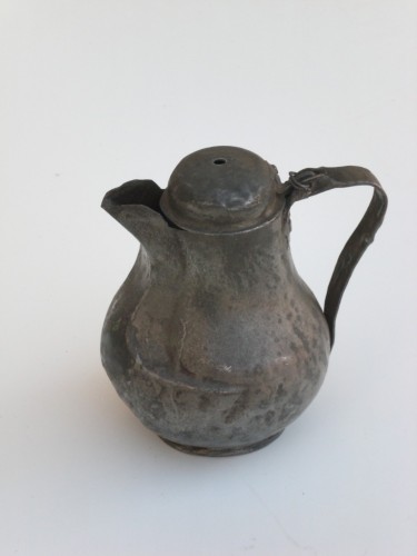 piccolo bricco in rame stagnato con beccuccio e coperchio annesso al corpo tramite una cerniera e fil di ferro. Il manico ad ansa è opposto al beccuccio.Notizie storico-critiche