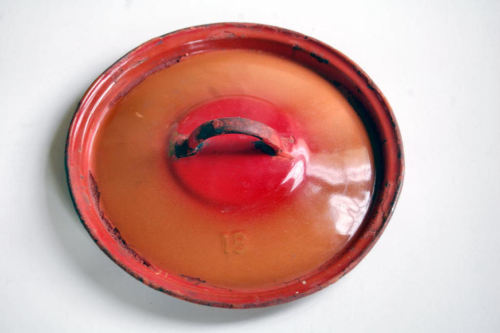 oggetto in ferro di forma circolare leggermente concavo; con bordo rialzato; dotato di manico arcuato, saldato sulla sommità del coperchio stesso. Smaltato di colore arancio allinterno e rosso e arancio sfumati allesterno. Reca il numero 18 in rilievo.Notizie storico-critiche