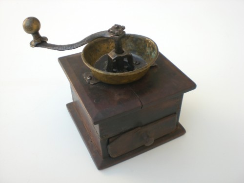 Contenitore in legno di forma quadrata con cassettino estraibile sul fondo per raccogliere il caffè. Nella parte superiore è fissato un macinino in ferro e ottone, anche il pomello è in ottone.Notizie storico-critiche