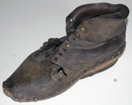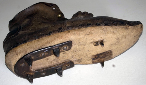 calzatura del piede destro con suola in legno e tomaia in cuoio; utilizzata dai lavoratori addetti alla fluitazione del legname