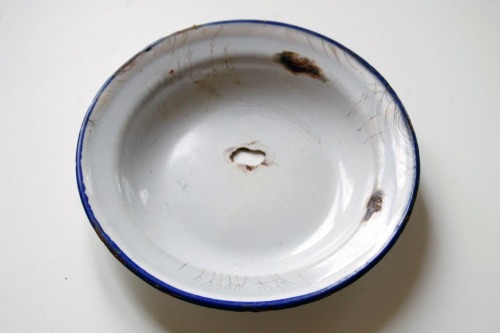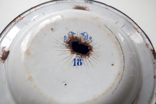 Basso recipiente di forma circolare con bordo piatto e largo leggermente svasato e spigolo arrotondato; il diametro della base è circa la metà del diametro del bordo superiore; in latta smaltata di bianco e bordata di blu.Notizie storico-critiche