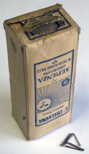 contenitore di cartone a base rettangolare; contiene numerose semenze in acciaio, ovvero chiodini utilizzati nella produzione di calzature, in genere per fissare la tomaia o il tacco alla suola