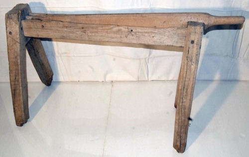 gramola a due fessure su cavalletto a quattro gambe: strumento utilizzato per la gramolatura della canapa, cioè per liberare il tiglio dalle parti legnose delle piante. I due spigoli della leva si incastrano in mezzo ai tre spigoli fissi del cavalletto.