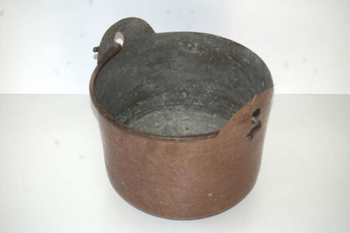 recipiente in rame, stagnato internamente, a sezione circolare, con fondo concavo. Dotato di manico ad arco in ferro, le cui estremità sono inserite entro due fori praticati in due sporgenze semicircolari del bordo superiore. La superficie esterna presenta decorazioni a motivi geometrici e vegetali realizzate a punzone.Notizie storico-critiche