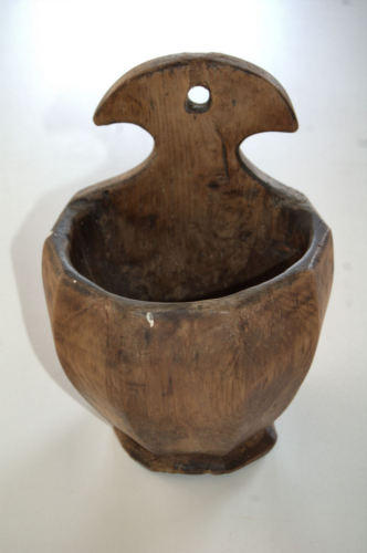 recipiente ricavato da un unico pezzo di legno a sezione semisferica; lato anteriore panciuto e sfaccettato (7 facce); lato posteriore piatto con parte superiore sagomata (mezzaluna) e forata al centro; poggiante su una base leggermente allargata di forma irregolare.Notizie storico-critiche