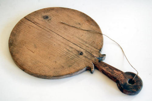 oggetto in legno di forma circolare dotato di manico allungato con estremità circolare forata al centro e base ornata da due sporgenze ricurve. Al foro è fissato uno spagoNotizie storico-critiche