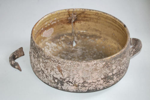 recipiente in terracotta a sezione circolare, smaltato solo allinterno di colore giallo; fondo un po più largo rispetto alla bocca; dotato di due manici orizzontali ad occhiello posti sotto il bordo superiore, luno opposto allaltro.Notizie storico-critiche