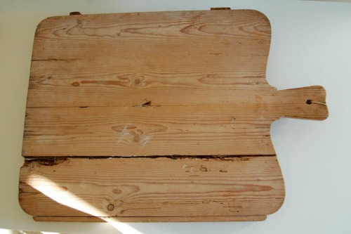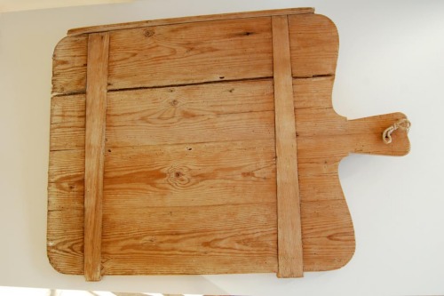 Utensile di grandi dimensioni di forma rettangolare, con gli angoli arrotondati, formato da quattro tavole lignee unite ad incastro; sul retro rinforzi lignei inseriti nello spessore in senso orizzontale; bordo sporgente sagomato fissato con chiodi nel senso della lunghezza; le due assi centrali sono più lunghe e sagomate a formare limpugnatura forata al centro.Notizie storico-critiche