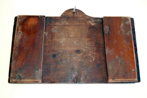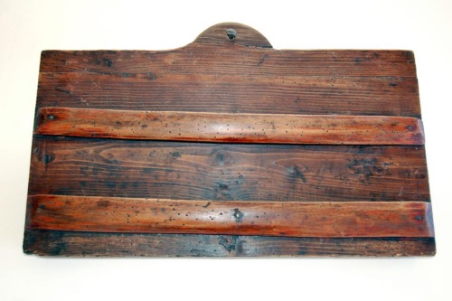 Suppellettile costituita da una tavola rettangolare con il bordo superiore sagomato e dotato di foro in cui è inserito un chiodo in ferro; sul retro sono applicate lateralmente, in senso verticale, 2 assi rettangolari; sul lato anteriore sono inchiodate, in senso orizzontale, 2 listelle di legno; esse si presentano più spesse alle estremità e sottili al centro al fine di ricavare lo spazio nel quale infilare i mestoli; la superficie delloggetto è ricoperta da una vernice scura.Notizie storico-critiche