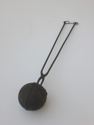 Utensile in metallo formato da due semisfere che vanno a formare una palla. Le semisfere sono collegate da un manico a tenaglia che serviva per aprire e chiudere le due parti. Le aste che formano il manico sono chiuse in fondo da un gancio metallico.Notizie storico-critiche